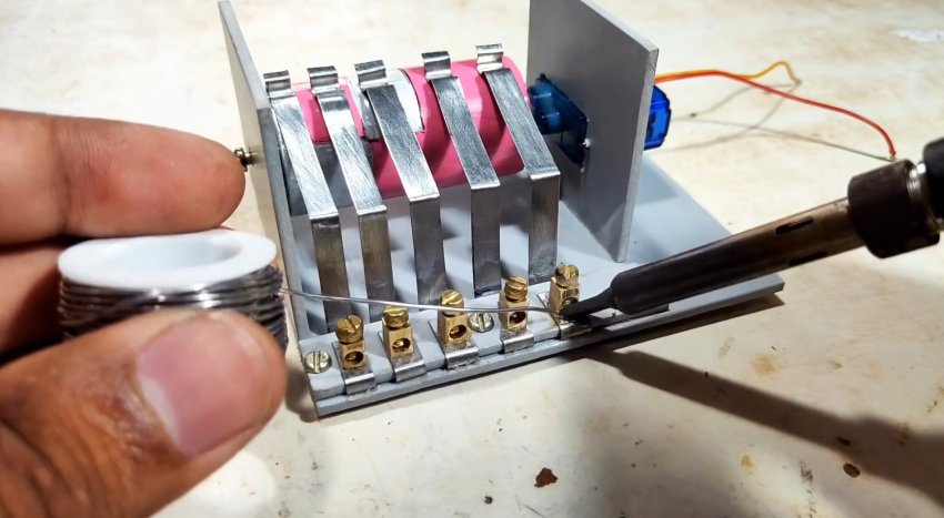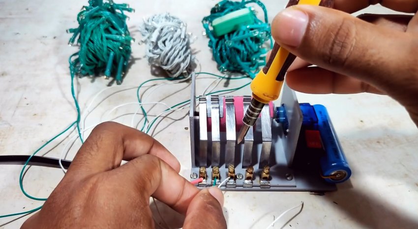 После этого один провод от кабеля питания необходимо подключить на крайний контакт, постоянно соприкасающийся с барабаном. По проводку от гирлянд следует подключить к остальным контактам. Оставшиеся же провода скручиваются вместе.