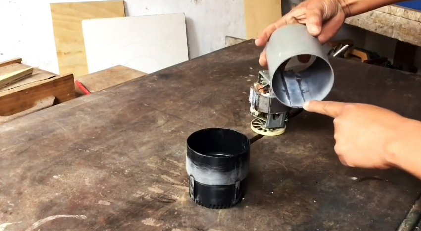 Из отрезка пластиковой канализационной трубы необходимо сделать корпус двигателя, который можно будет поместить в диффузор.