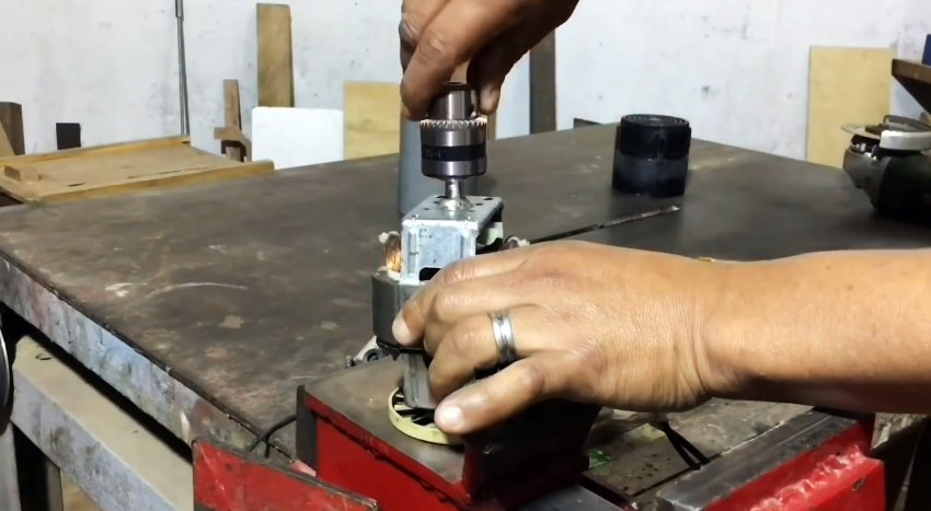 Затем на свободную от крыльчатки сторону вала мотора нужно закрепить сверлильный патрон. Так как диаметры не совпадают, то можно надеть на него втулку из трубки.