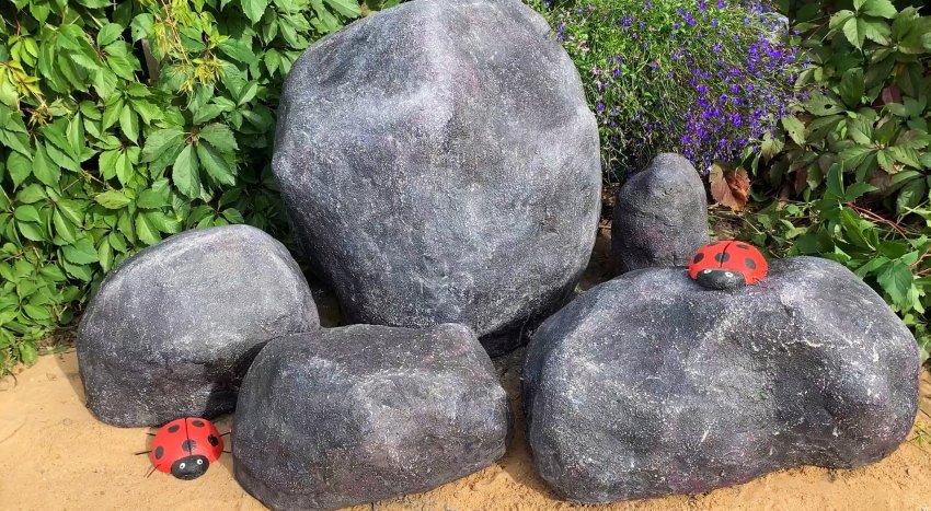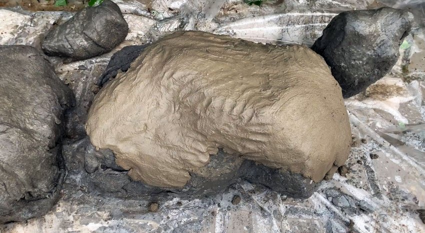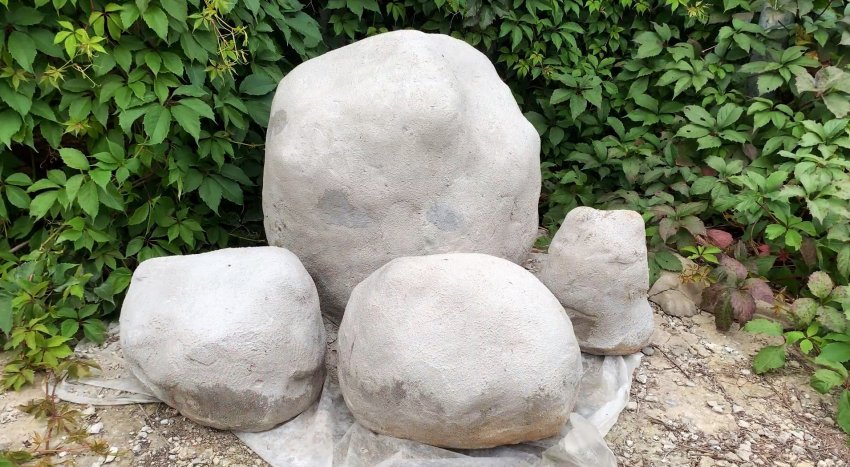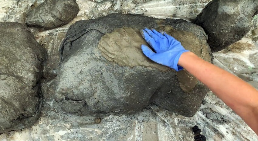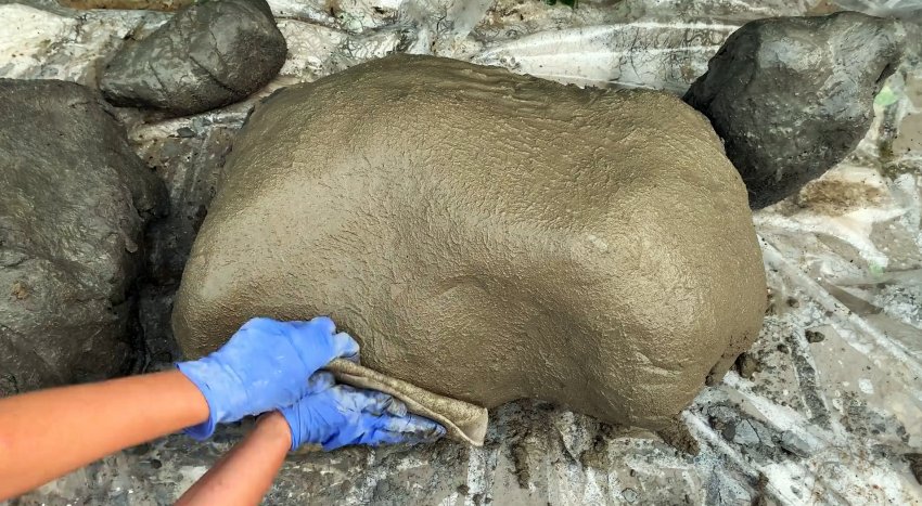 Оштукатурив таким способом камень, нужно доработать его рельеф. Удачный результат дает прикладывание на поверхность вспененного полиэтилена. Он оставляет реалистичный отпечаток. Через 48 часов камень можно перевернуть, и сделать таким же способом дно.