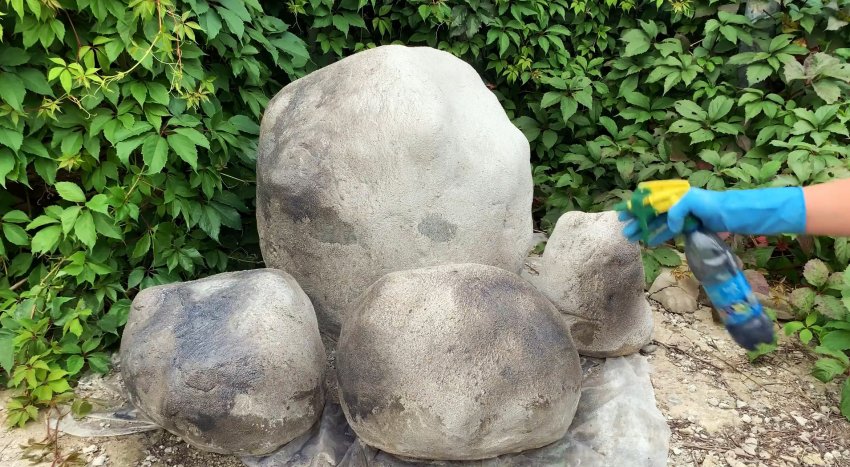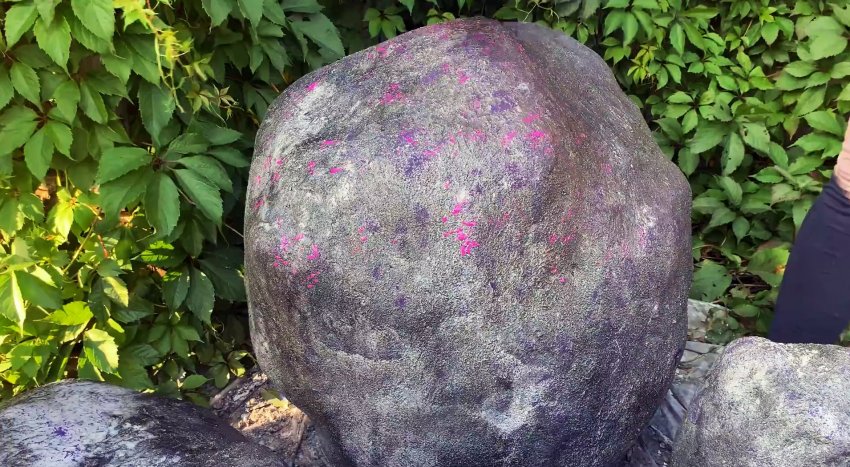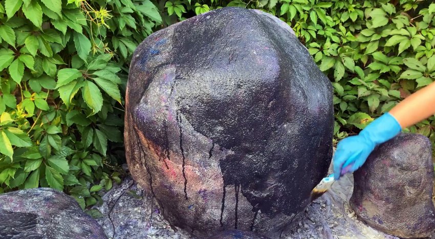 Далее предстоит окрашивание, чтобы придать бетону реалистичность настоящего камня. Для этого он покрывается грунтовкой с добавлением черного колера. Она набрызгивается опрыскивателем. Вторым слоем после высыхания первого наносится грунтовка с колером ирис.