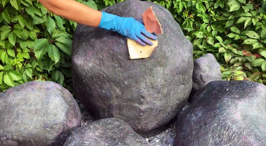 На второй день камень станет светлее, чем был изначально после последнего слоя грунтовки. На нем снова проявятся цветные вкрапления. После этого его можно немного доработать шкуркой, убрав острые наплывы бетона. Такие потертости улучшат его внешний вид.
