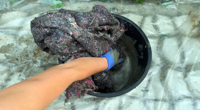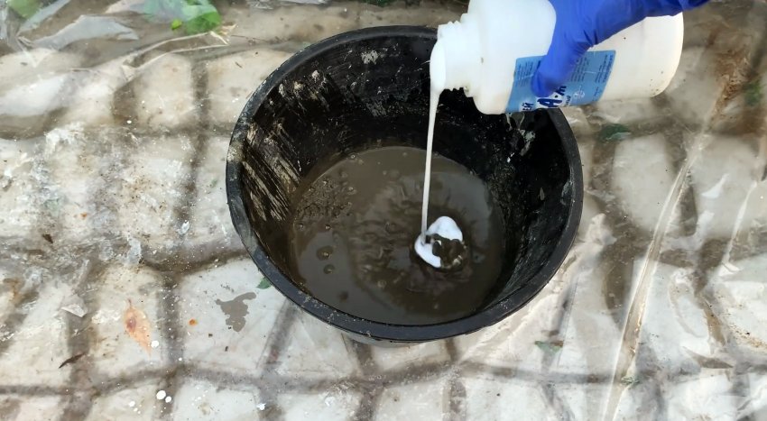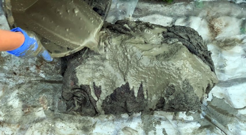 Далее замешиваем цементный раствор. В цемент добавляется только вода, и немного клея ПВА для пластичности. Нужно сделать жидкий состав, и вымочить в нем большой кусок ветоши либо мешковину.