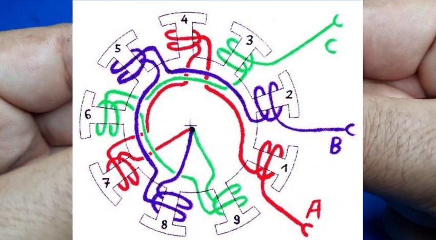Важно придерживаться представленной схемы намотки. Цельный отрезок проволоки без разрывов наматывается на 1, 4 и 7-й зубец. Затем второй на зубцы 2, 5 и 8, а третий на 3, 6 и 9.