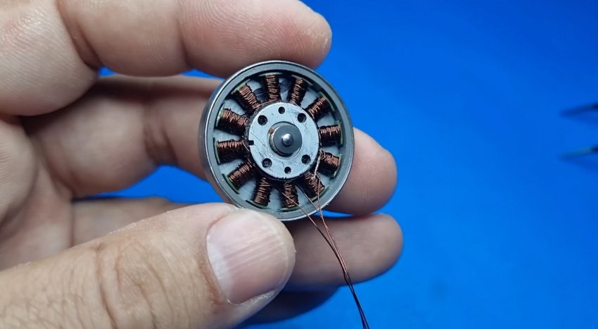 Теперь остается запитать регулятор от 12В, и запустить двигатель для проверки. Это дешевый простой способ получать мощные компактные двигатели. Форма сердечника позволяет перематывать проволоку вручную без особых усилий и соблюдения сложной схемы. Все делается элементарно.