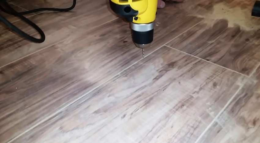 Затем просверливаем ламинат на нем, желательно на замке, чтобы отверстие меньше бросалось в глаза.