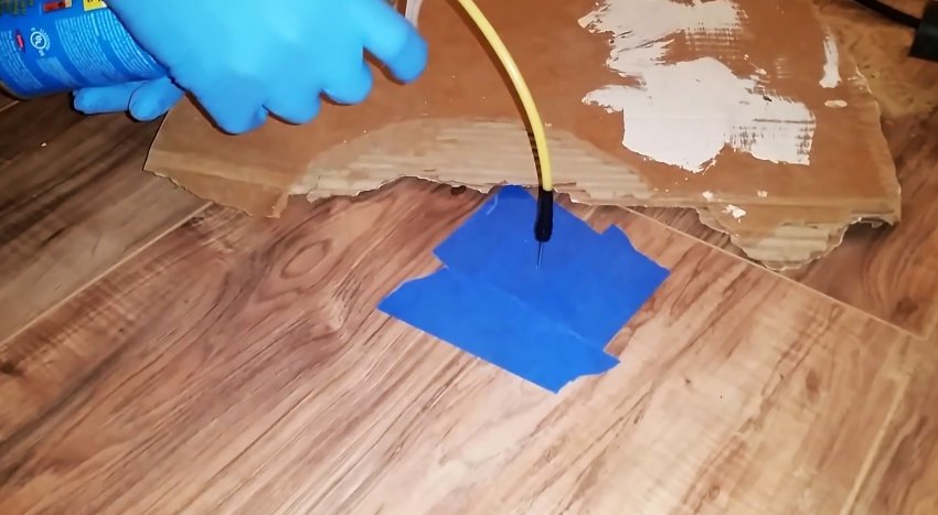 Вокруг отверстия приклеиваем малярную ленту или изоленту. Это нужно, чтобы в случае выхода монтажная пена не испачкать пол. Затем в отверстие вставлять иголка, и внутрь подается немного пены.
