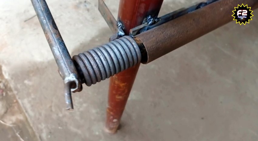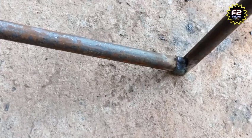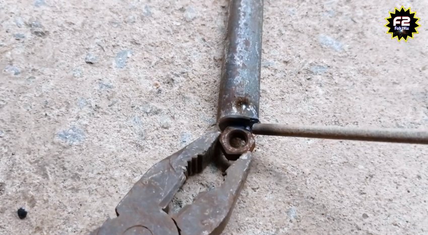 Далее отпиливаем трубку 32 мм и кругляк 20 мм длиной по 40 см. На один край кругляка приваривается гайка М8, а на второй под прямым углом отрезок такого же прута.
