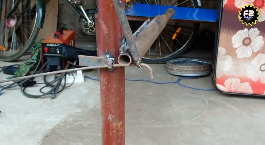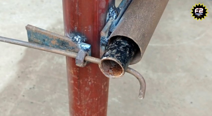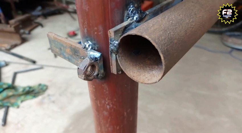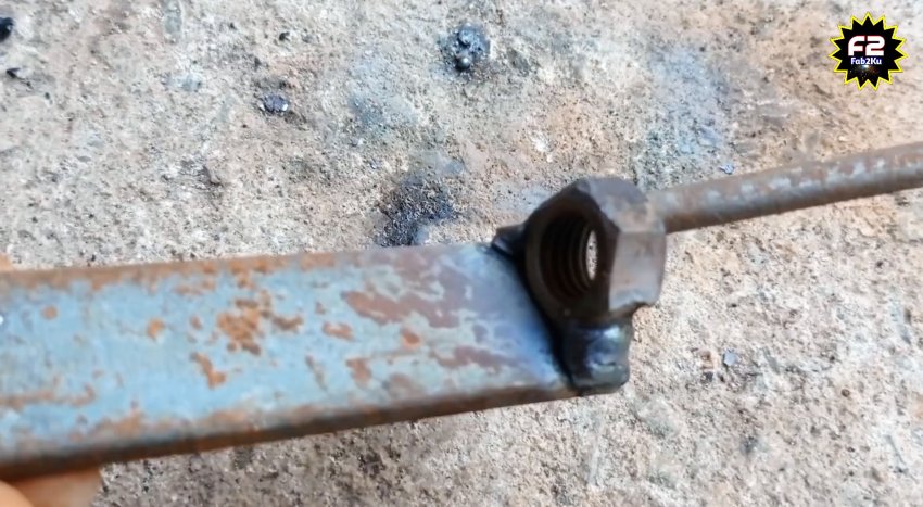 К небольшому отрезку полосы привариваем гайку М8. Затем находим на участке забетонированный столб или отдельно его вкапываем, и привариваем к нему первую и последнюю заготовки как на фото. Между ними нужно соблюсти прямой угол. Причем полоса с гайкой должна быть немного ниже центра трубы.