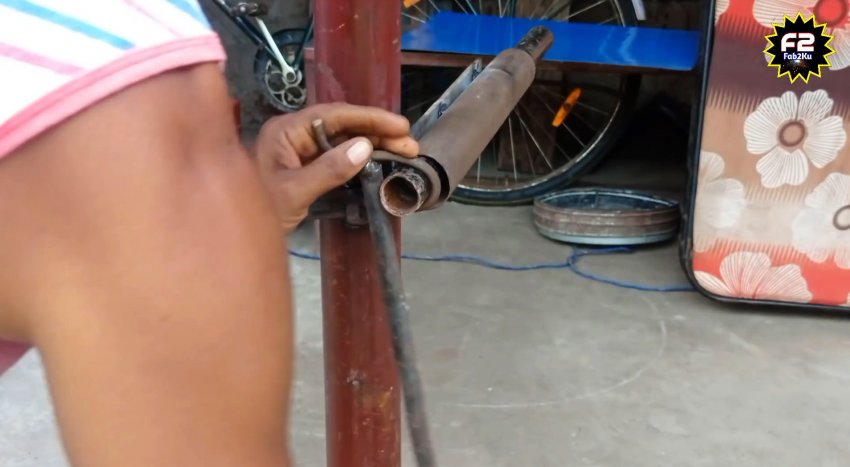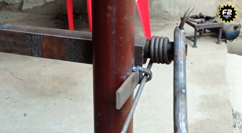 Теперь помещаем в приваренную трубу ранее подготовленную заготовку из трубки 32 мм. Берем пруток 4-8 мм, и закручиваем на его конце крючок. После этого пропускаем прут через гайку на станке, и подцепляем ручкой из кругляка.