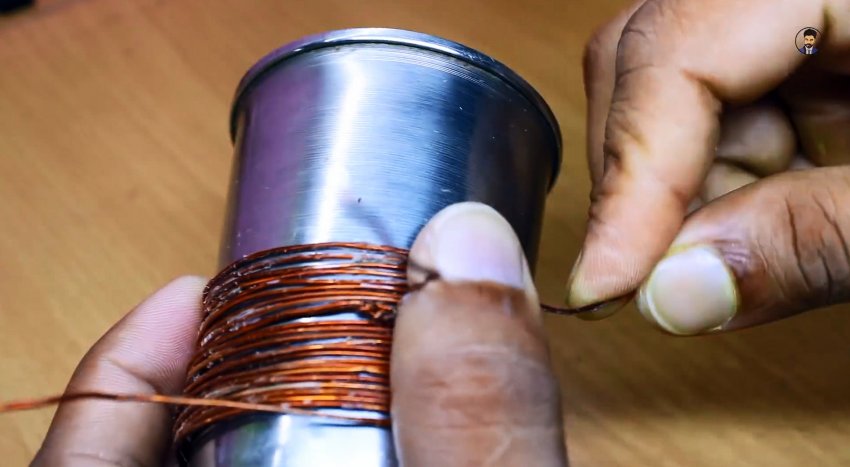 Катушку изнутри нужно изолировать, чтобы она напрямую не касалась стакана.