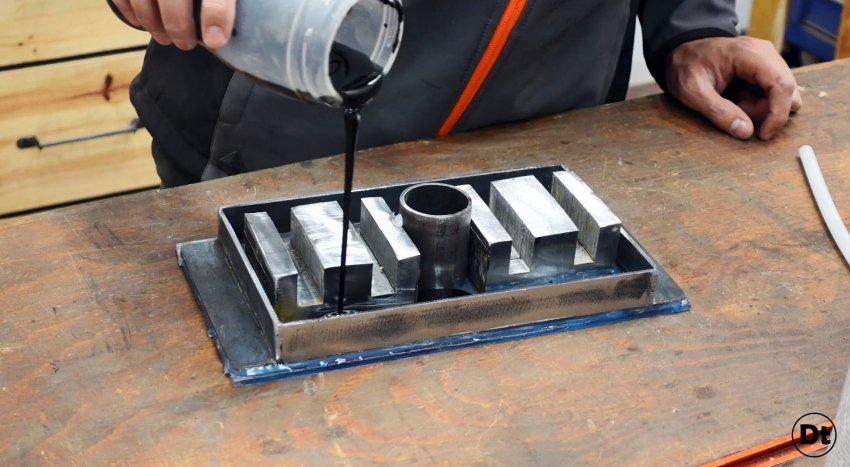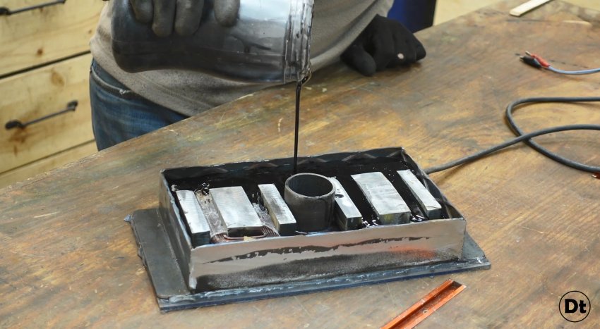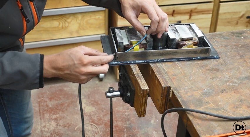 Отверстие для ввода провода герметизируете термоклеем, и рамка полностью заливается смолой. Нужно, чтобы ее высоты хватило полностью залить трансформаторы. Если же уголок узкий, то можно его нарастить, приварив полосу.