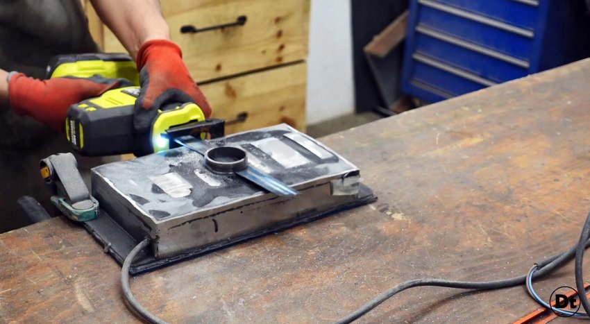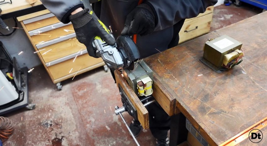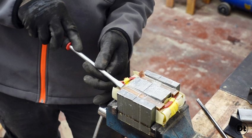 Для изготовления электромагнита нужно спилить пластины на сердечниках двух трансформаторов микроволновой печи. Для этого делается по 2 реза на швах, после чего пластины отбиваются молотком.