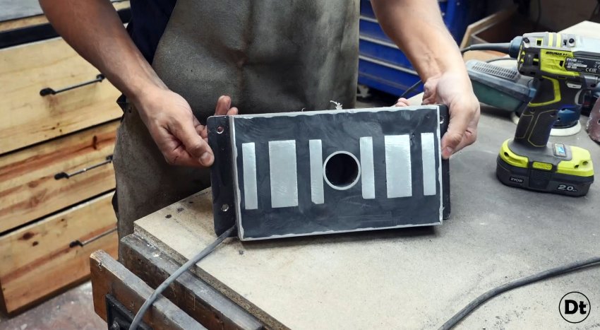 Когда состав схватится, нужно просверлить рамку, чтобы ввести в нее провод. В сердечники вставляются катушки, после чего к ним подсоединяется провод.