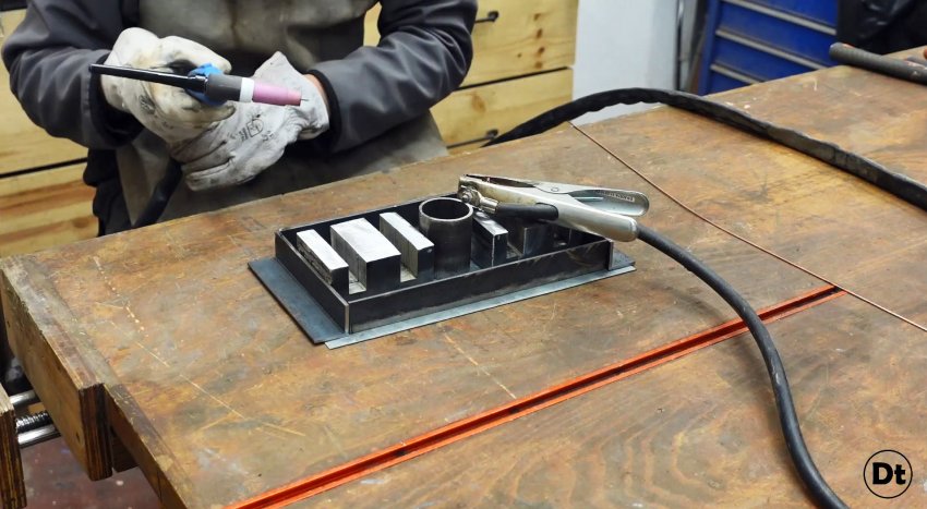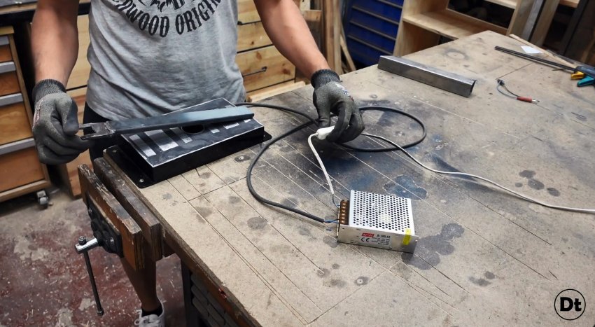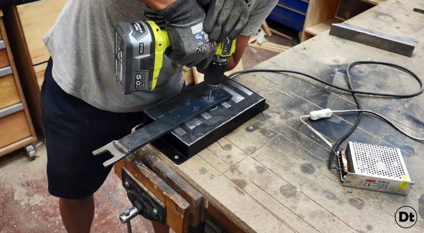 Устройство прикручивается к токарному, фрезерному станку, рабочей поверхности стола или верстака. Для этого в его углах просверливаются отверстия. Теперь при нажатии на выключатель, можно запускать магнит, намертво притягивая к нему все металлическое уложенное сверху. Трубка в центре позволят сверлить сверху, не повреждая сверлом само устройство.