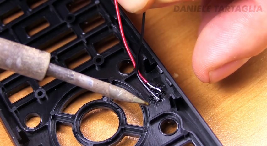 Установим эту кнопку. Припаяем провода и зафиксируем горячим клеем.