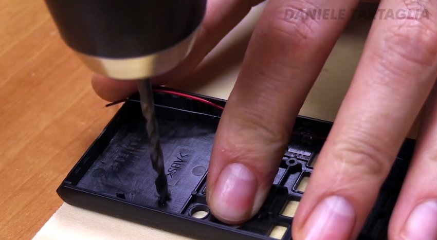 Просверлим 2 отверстия (на фото 4, так как 2 сделаны по ошибке) тонким сверлом под вывода светодиода.