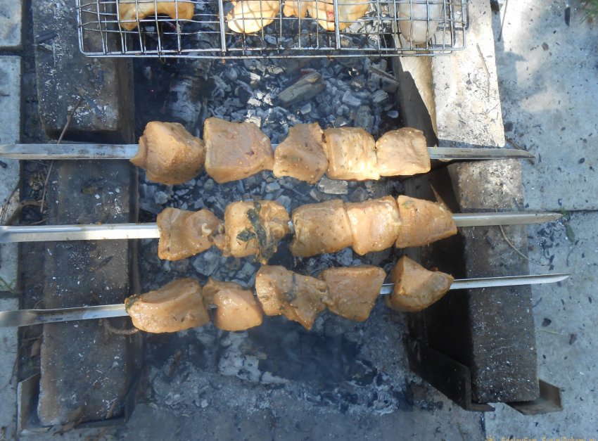 Напротив порционные куски на шампура, обжарить шашлык в мангале.