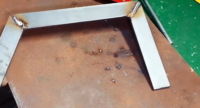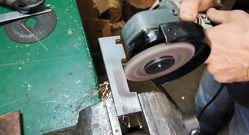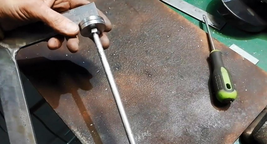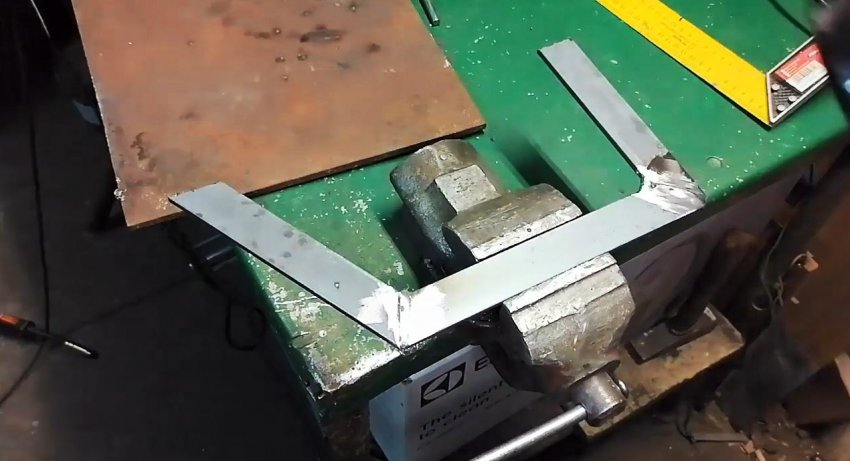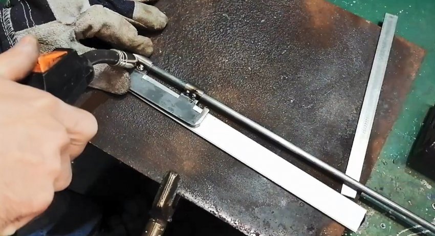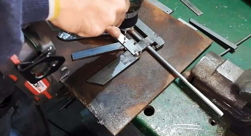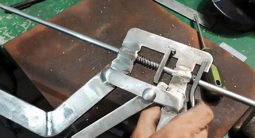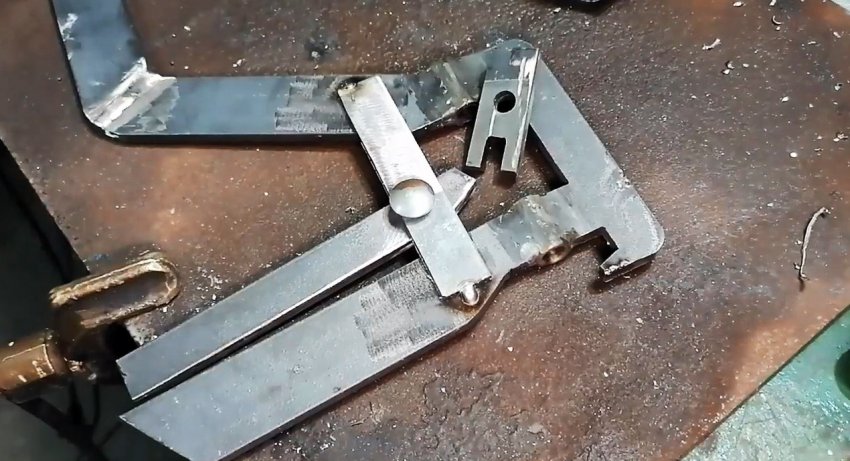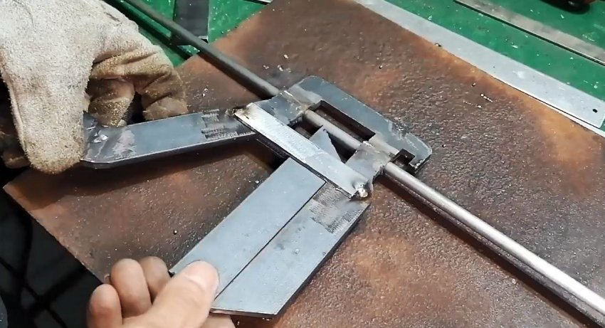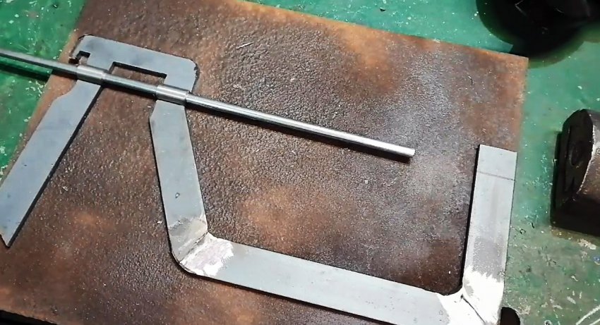 Между ручкой и основной частью рамки привариваются 2 перемычки из полосы. Их нужно просверлить, чтобы установить на заклепку рычаг струбцины. Край последнего требуется сделать заостренным.