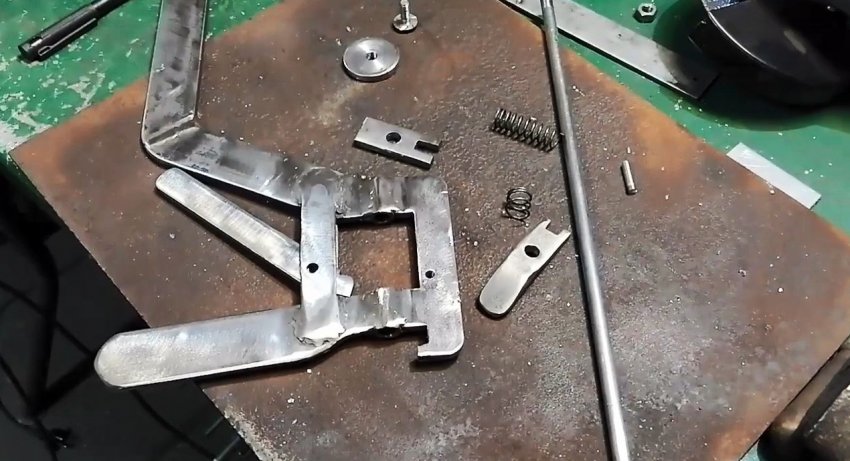 Затем собирается механизм сжатия с ранее сделанными двумя деталями, штоком и пружиной. В станине нужно будет просверлить отверстие, чтобы вкрутить ограничитель для стопора.