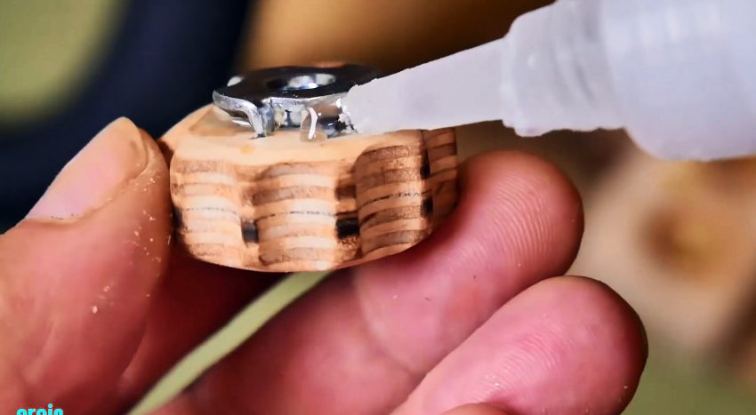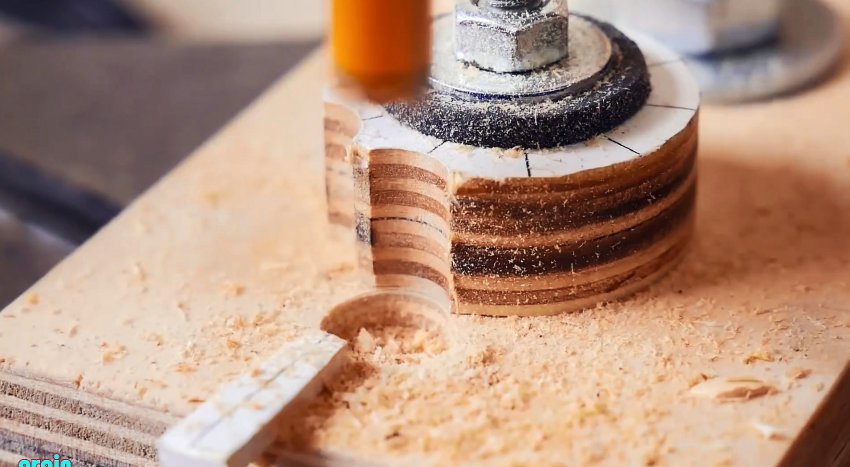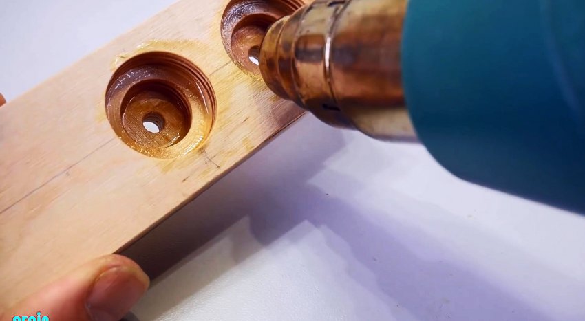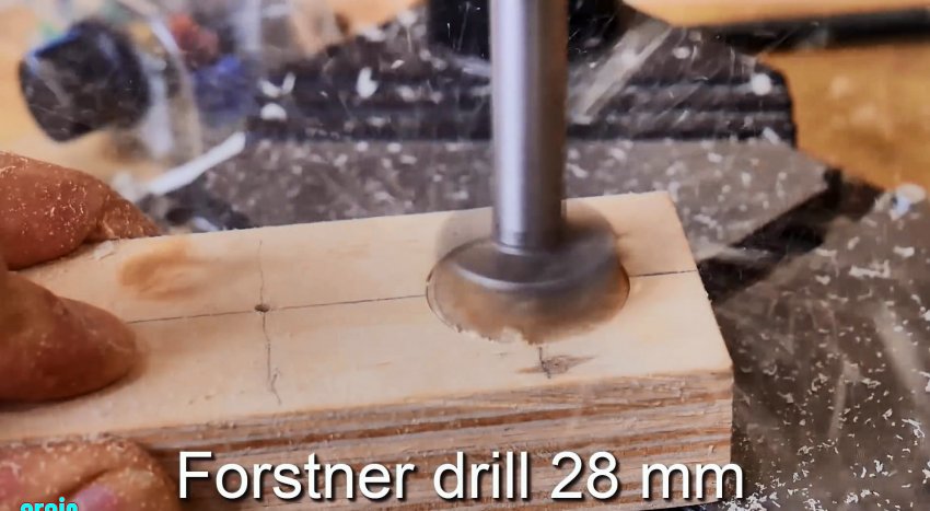 Сначала нужно сделать литьевую форму. В доске или толстой фанере высверливается глухое отверстие сверлом Форстнера 28 мм на глубину 7-8 мм.