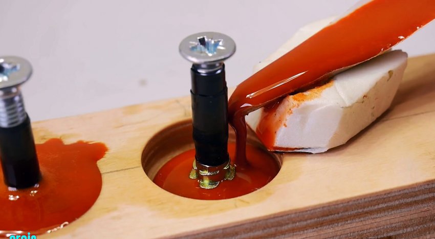 Далее берется болт, на него наматывается фумлента и наворачивается мебельная втулка. Затем он устанавливается в форму, и она заливается эпоксидной смолой.