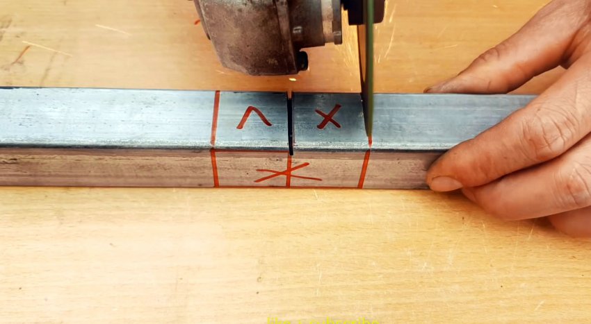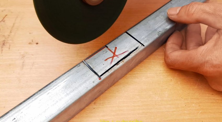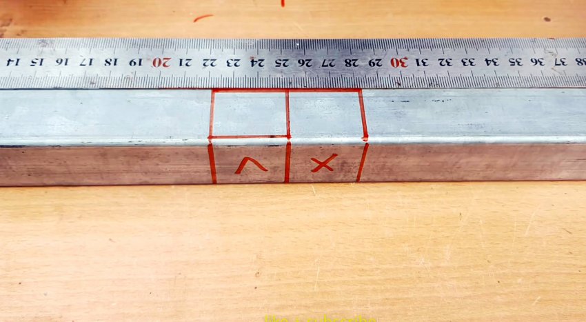 Суть соединения в том, что одна труба квадратного сечения сгибается, создавая прямой угол, а к ней под 90 градусов прикручивается такая же вторая трубка. Вся загвоздка в выполнении правильной подрезки первой заготовки. Для этого нужно определить место выполнения изгиба. По нему с помощью угольника рисуется поперечная линия. Необходимо также начертить с боков от нее по параллели, с отступом на ширину трубы. Такие же 3 линии рисуются на двух соседних сторонах заготовки.