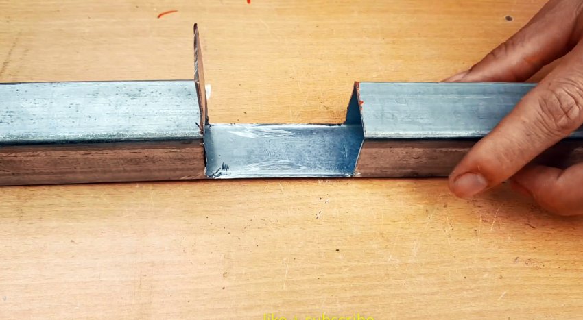 На оставшейся не спиленной стороне трубы требуется сделать насечки с двух сторон ровно по центру. Это нужно, чтобы согнуть ее внутрь под прямым углом.