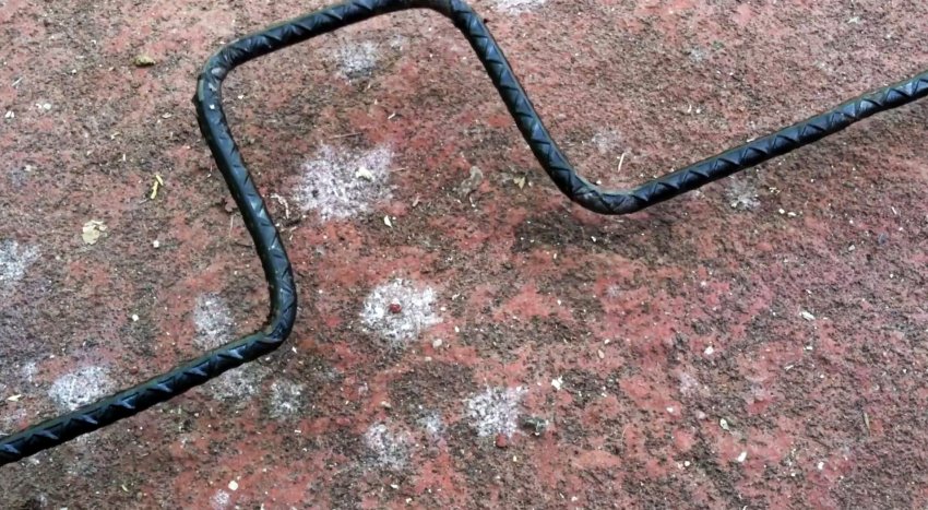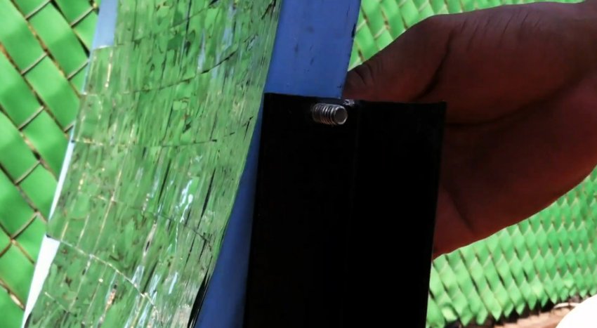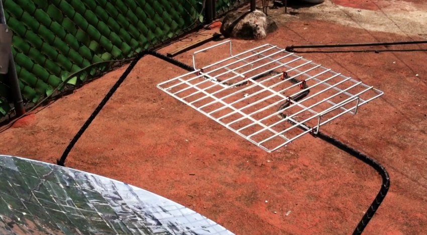 Далее нужно определить расстояние от рефлектора, в котором отраженные от него лучи собираются в один пучок. Основываясь на полученном замере, из арматуры выгибается скоба, которая послужит подставкой для размещения объектов нагрева. Скобу можно прижать к станине теми же болтами, что удерживают отражатель.