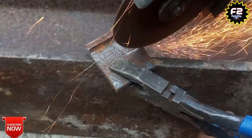 Укладываем заготовку одним концом между меньшими ограничителями, приваренными к подошве наковальни, и начинаем размеренно и с одинаковым усилием наносить удары по верхнему ребру полосы, постепенно проталкивая ее от головки к подошве наковальни.