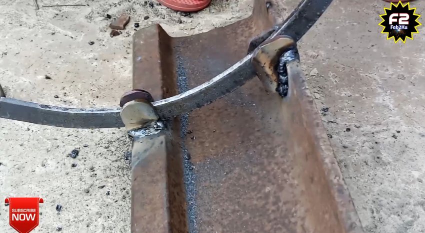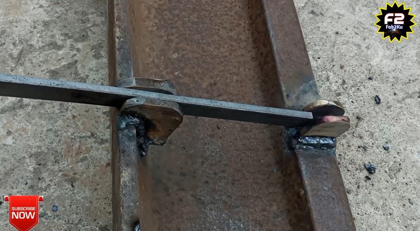 К полосе, удерживаемой на ребре, прикладываем с двух сторон меньшие пластины, которые плоской гранью соприкасаются с боковой частью головки рельса.