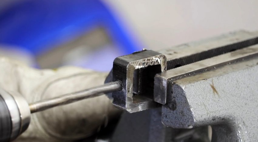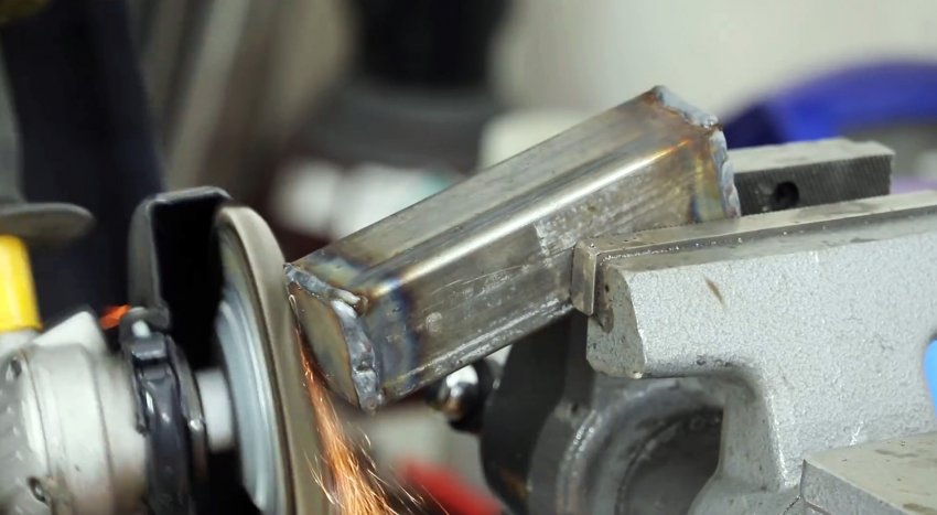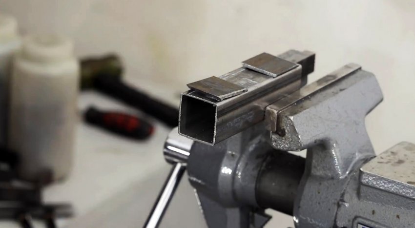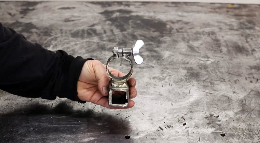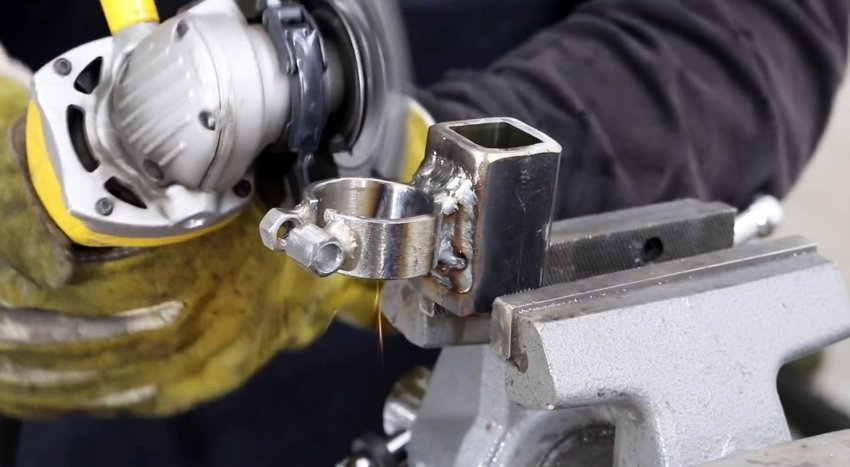 Хомут через проставку из пластинки приваривается к отрезку профильной трубы 20х20 мм. У последней обязательно нужно сточить внутренний сварной шов.
