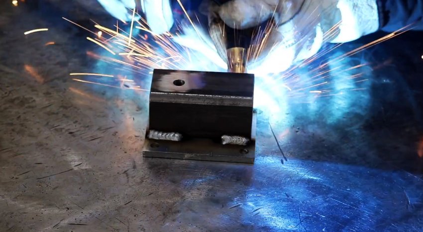 Для удобства фиксации подошвы самой стойки, нужно сварить под нее подставку. Она делается из пластины металла 100х100 мм и швеллера шириной 50 мм.