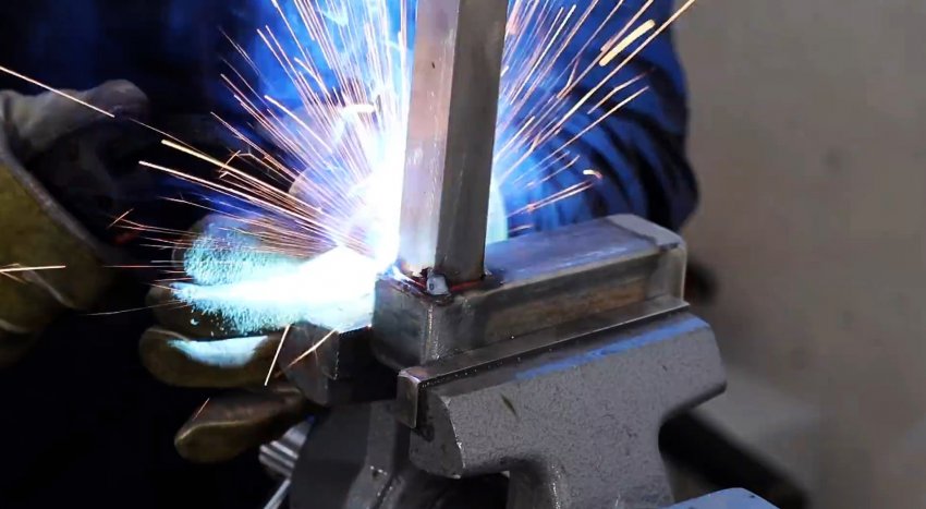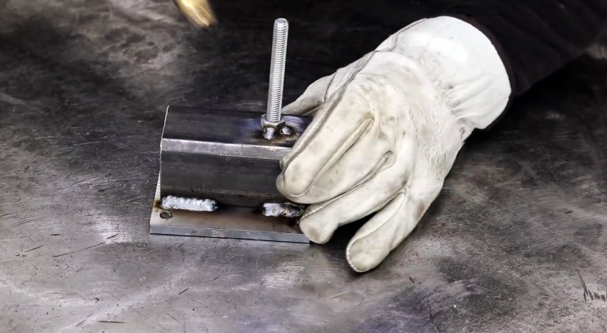 Далее требуется сварить саму Г-образную стойку. Ее подошва изготавливается из профильной трубы 40х40 мм длиной 100 мм. Концы последней необходимо заварить заглушками.