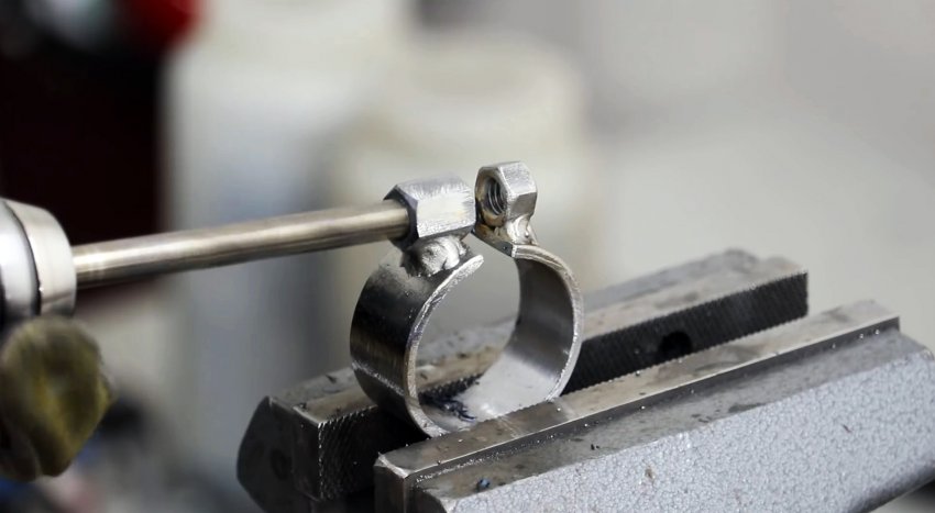 В результате получается хомут для зажатия корпуса дрели. Он будет зажимать ее на месте съемной штатной рукояти. В одной его гайке следует высверлить резьбу.