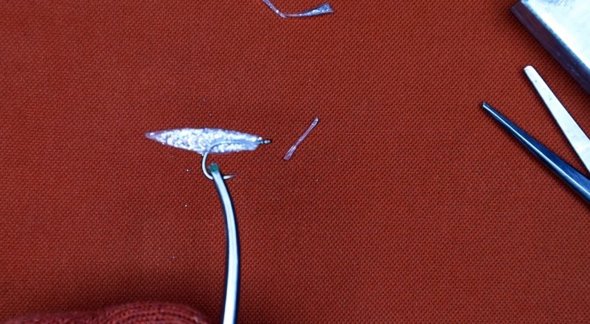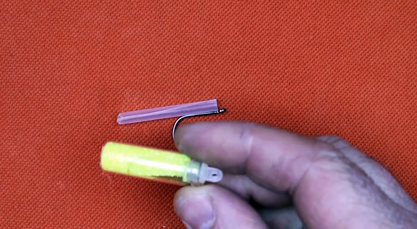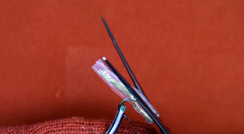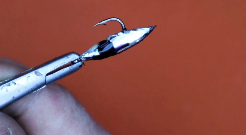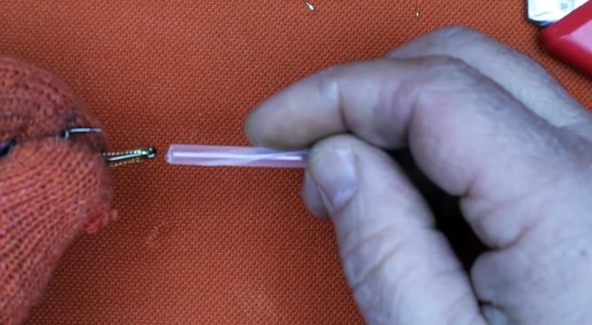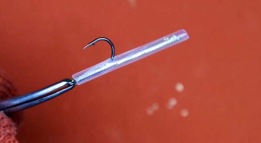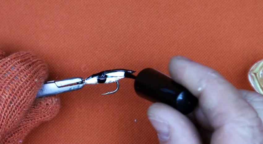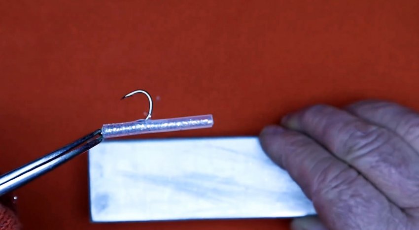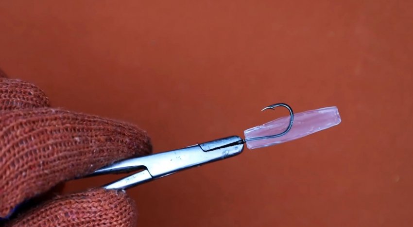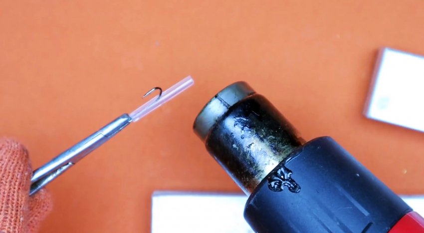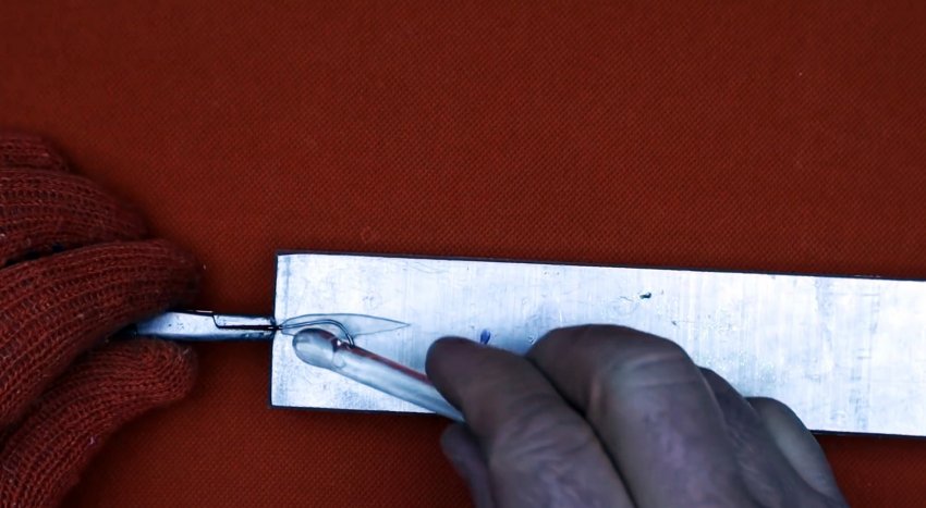Ушко крючка захватывается плоскогубцами или другим инструментом. Затем нужно разогреть трубку любым доступным способом. Спустя пару секунд, когда она размягчится, требуется зажать ее между двумя плоскостями. Это могут быть стальные или деревянные пластины.