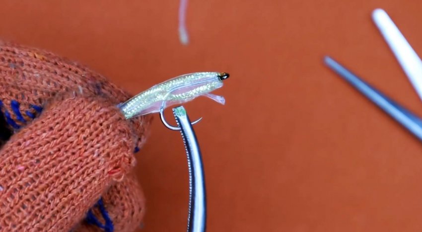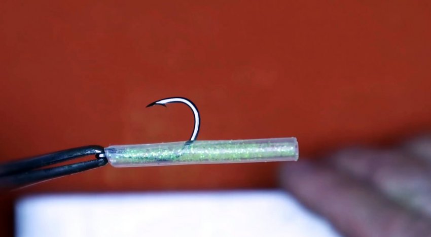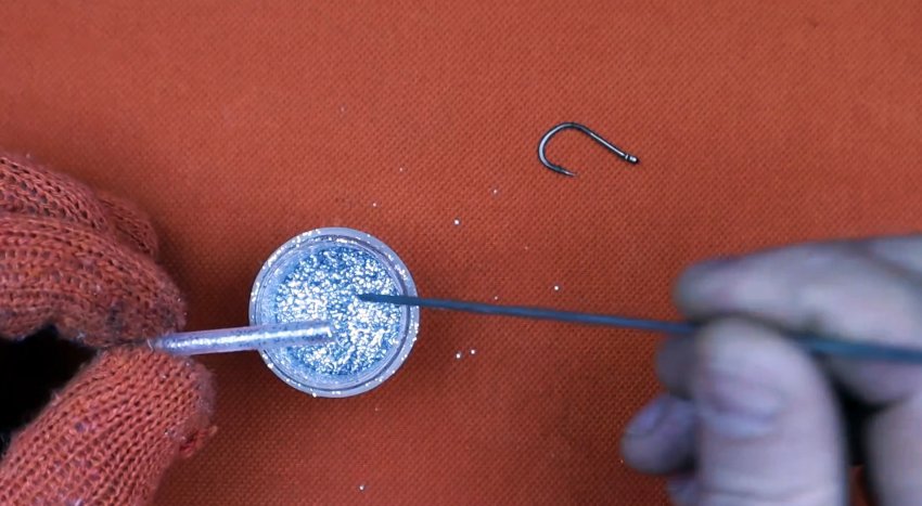 Также можно готовый стример покрасить лаком и припорошить блестками. Получается яркая заметная приманка, на изготовление которой тратится еще меньше времени, чем на остальные. В этом случае нужно нанести лак еще раз, чтобы закрыть влипшиеся в первый слой блестки.
