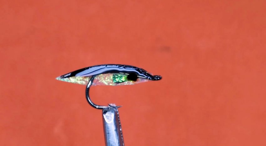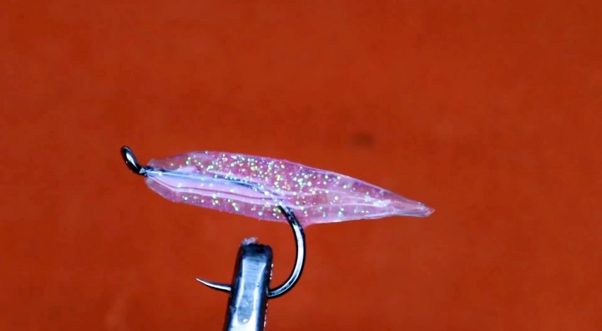 Второй вариант имитации рыбки предусматривает наполнение трубки перед сжатием блестками для маникюра.