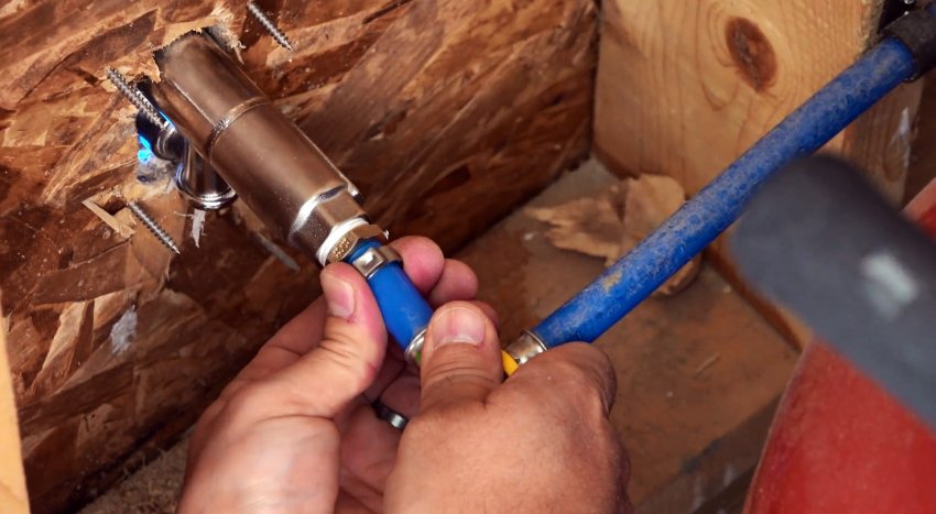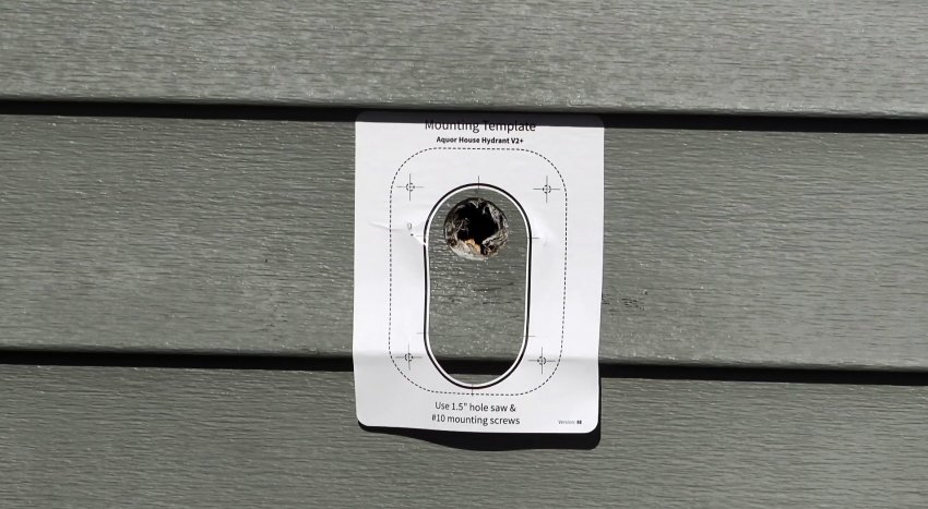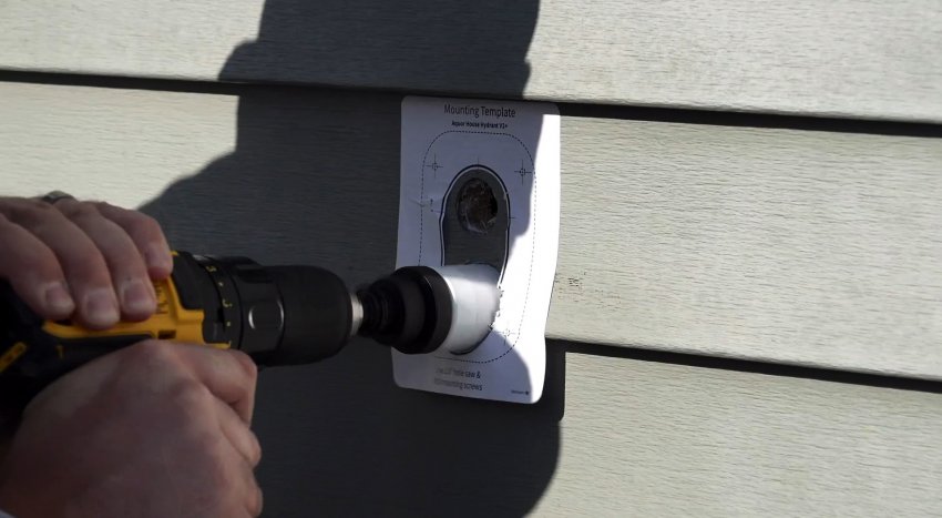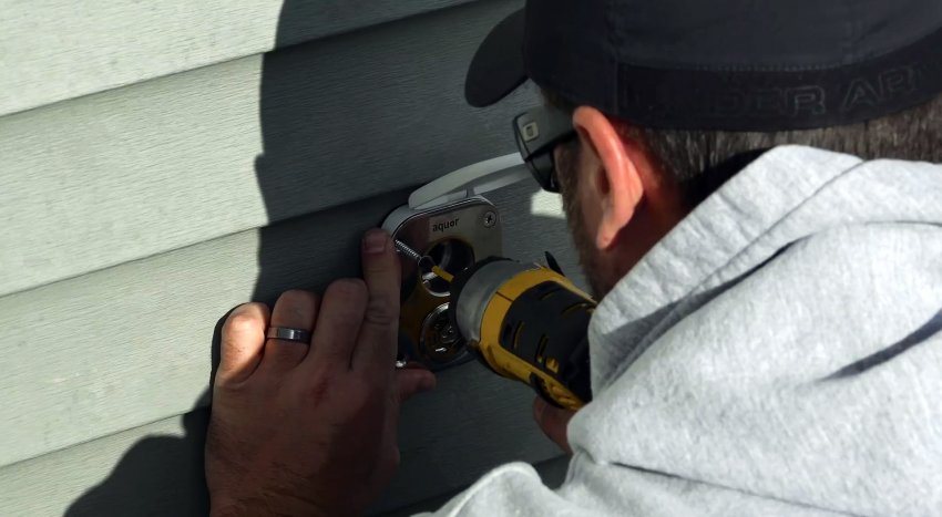 Гидрант вставляется в отверстие, и в зависимости от материала стены закрепляется саморезами или дюбелями.