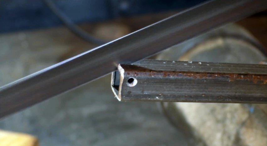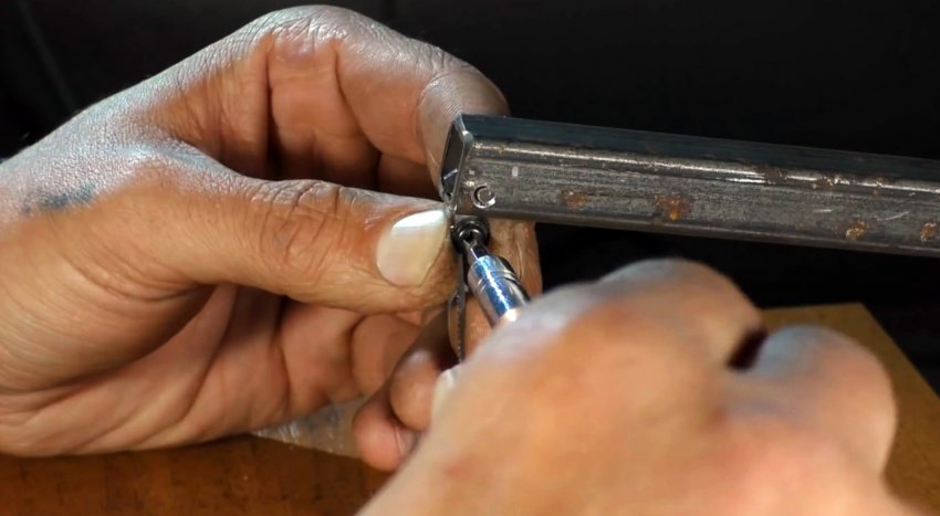 Заготовки из трубы 20х20 мм свариваются под прямым углом. На краю короткой требуется вырезать проушины под трубу 15х15 мм и просверлить их. Составляющие соединяются осью. В результате должна получиться Н-образная деталь с подвижной стороной, работающей как рычаг.
