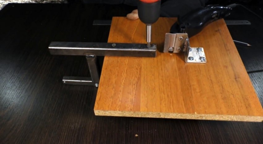 С обратной стороной нужно прикрутить с помощью уголка машинку так, чтобы вводимая сквозь столик пилочка могла зажиматься винтом на подвижном ноже.