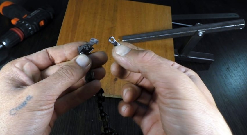На край рычага приклепывается соединяющий сегменту от пильной цепи.