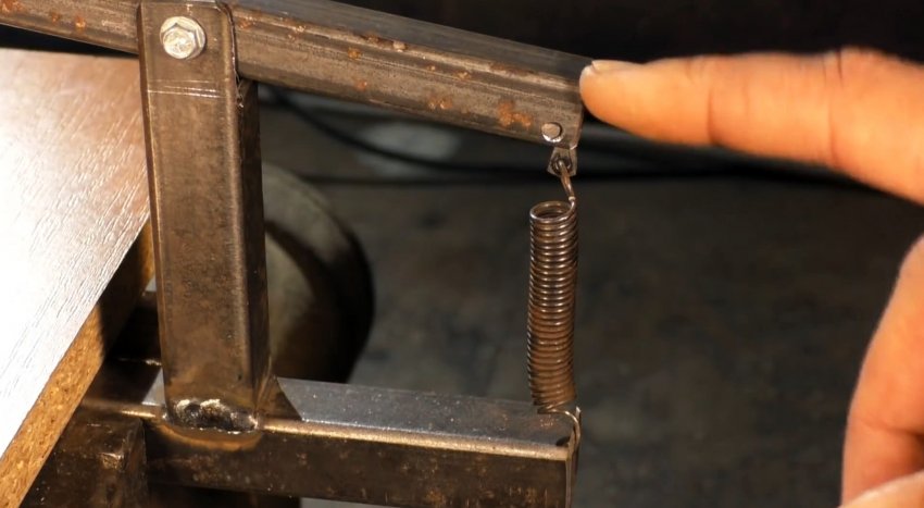 Сам станок нужно оборудовать ножками, но лучше всего просто зажимать его в тиски. Для оттягивания рычага, на его край натягивается пружина.