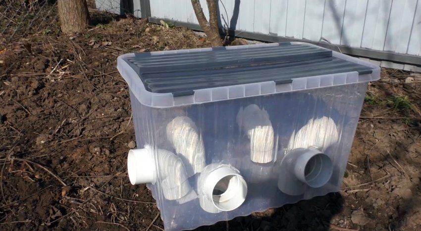 В стенках контейнера нужно просверлить отверстия коронкой по дереву под диаметры уголков. Колена требуется вставить так, чтобы их низ возвышался над дном лотка на 10 мм.