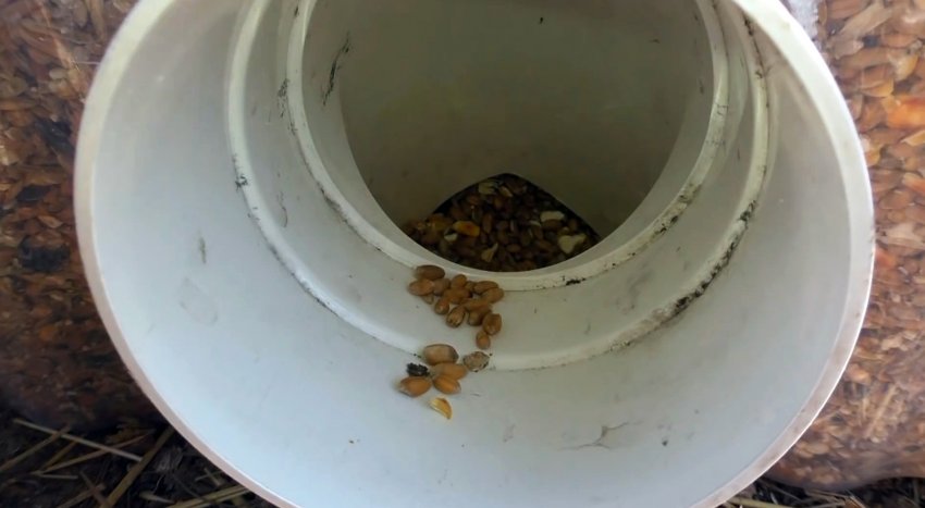 После его высыхания кормушка помещается в курятнике, и заполняется кормами. Куры смогут клевать их, просовывая головы внутрь через уголки.