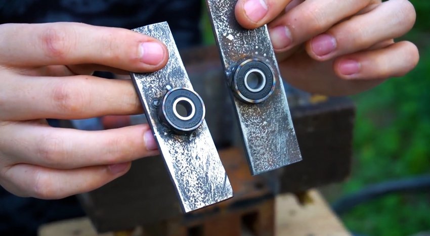 Теперь нужно приварить на сердечники крепление из полосы для якоря. Подшипники на нее можно также приварить. Нужно, чтобы якорь свободно вращался.