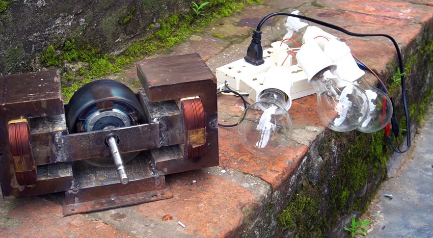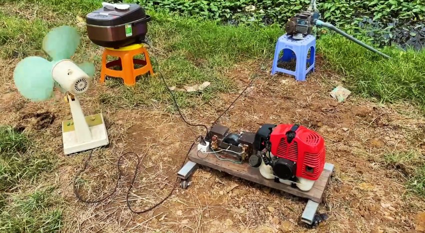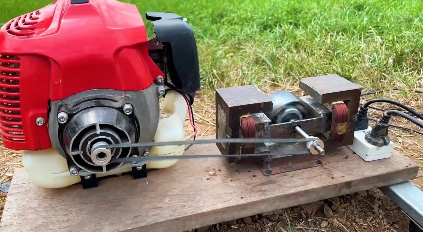 Генератор переменного тока на 220В для нетребовательных бытовых приборов можно сделать своими руками. Для этого потребуется пара трансформаторов от СВЧ микроволновых печей, и еще несколько доступных запчастей. В качестве привода для него можно использовать любой двухтактный ДВС, к примеру, от мотокосы или бензопилы.