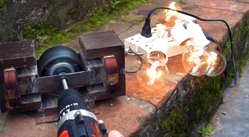 При вращении шуруповертом лампы 220 В, в роли нагрузки, хорошо светятся.