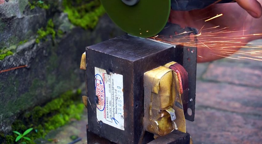 У двух исправных трансформаторов из микроволновок нужно разрезать сердечники по шву, и удалить пластины. Из них вынимается накальная и повышающая обмотка.