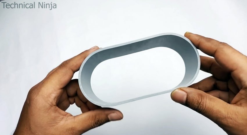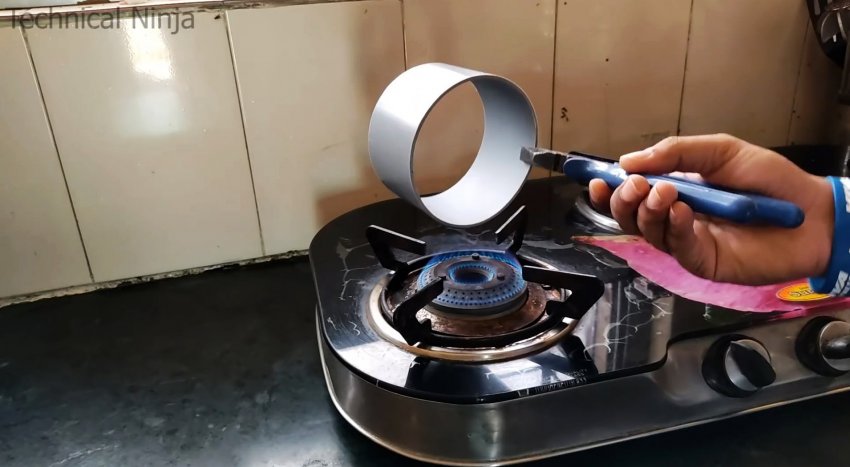 Подставка вентилятора делается из трубы 110 мм длиной 60-80 мм. Ее нужно нагреть и растянуть, вставив 2 трубки по 50 мм, пока заготовка не застынет. Ее края обрабатываются напильником. Из листового пластика под нее вырезаются заглушки.